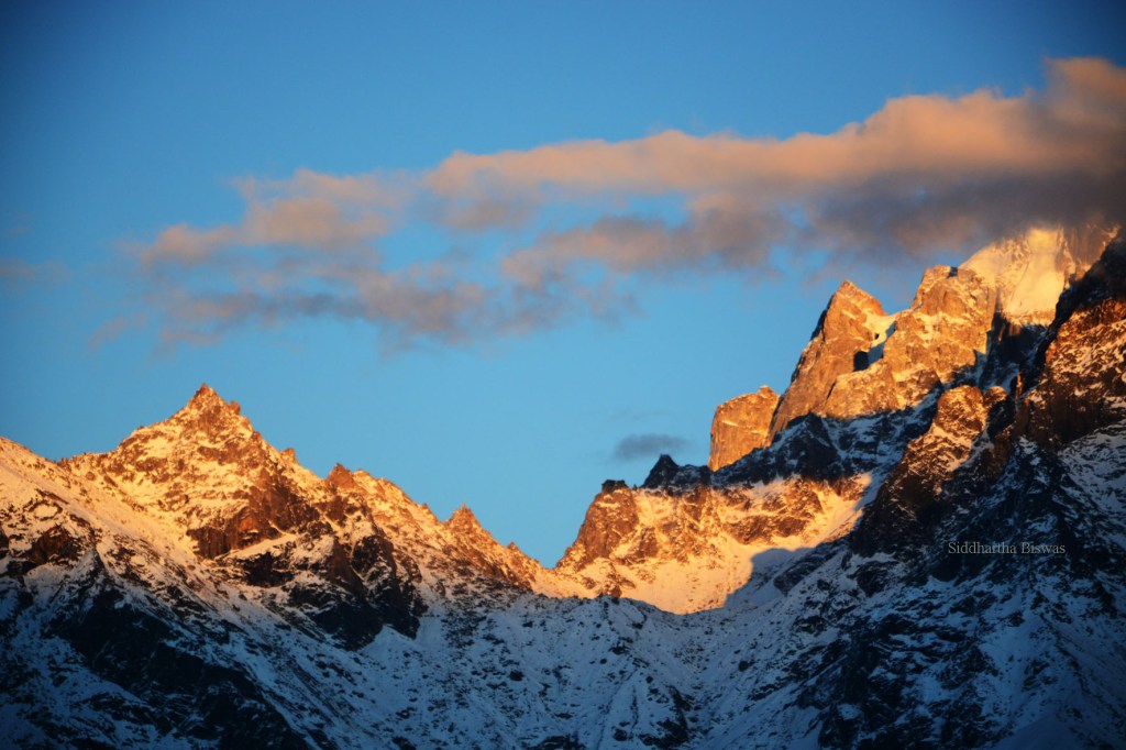 The ‘site-seeing’ took about two hours. We spent the rest of the afternoon just watching the magnificent cliffs. The snowfall had made them even more brilliant. The colour of the snow changed gradually, from afternoon white to sunset golden, then evening red and finally the melancholy ivory of the dying day.