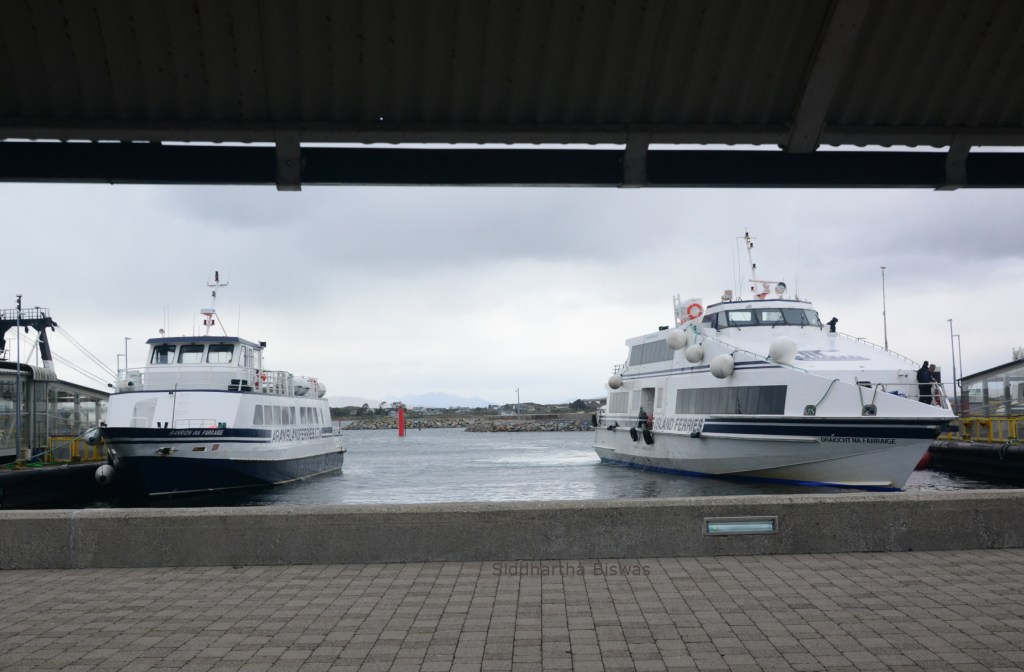 As I had mentioned, the weather gods weren’t happy with us. Dark clouds were floating in with a strong freezing wind. We were ill-prepared. A bit of misunderstanding had created a rush in the morning that had made us literally run. Our usual meticulous prep had to be sacrificed. Since weather forecasts had cast a shadow on our plans, we decided to go to the island while there was some kind of sun in the sky. We almost missed the bus to the ferry, but the Aran Island Ferry people were kind, and the bus waited for us. The 36 km drive through the amazing Connemara coast, on the Wild Atlantic Coast Highway, is in itself a pleasure. There were two ferries waiting. One was for Inishmore – the bigger and swankier – the other – much more homely – was for the passengers going to Inis Meáin and Inis Orir.